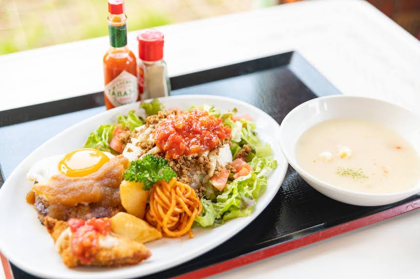 そしてかつて本部町でJリーグのサンフレッチェ広島がキャンプを行ったときに記念して作ったメニューであるJランチ。ハワイ生まれのロコモコと沖縄生まれのタコライスが同時に食べられるワンプレートで、こちらも人気のメニューです。