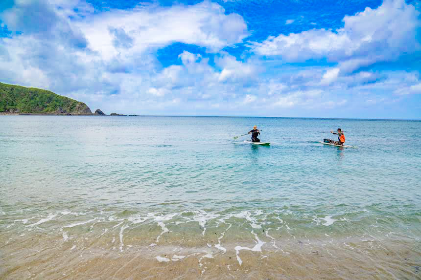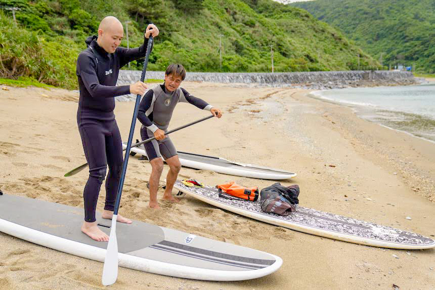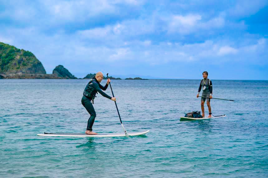 SUPとは、「Stand Up Paddle board」の略称で、サーフボードの上に立ちパドルを使って漕ぎ進むハワイ発祥のウォータースポーツです。海岸に着くと、大田さんがまず砂浜でボードへの乗り方、立ち方、パドルでの漕ぎ方をレクチャーしてくれました。ボードを持つと案外軽いことに驚きながら、いざ、海へ!