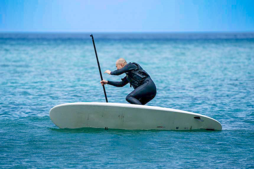 慣れてきたところで立ち漕ぎに挑戦。ボードのやや前に立ち、パドルの先をボードの前方に突くようにして重心を作り、三点を支えに直立。が、漕ぎ始めてすぐにバランスを崩し、この日最初の海面へのダイブとなりました。しかし、太陽の光や潮の匂い、風、海水の心地よさを五感でしっかり堪能できるのは、やはり最高の気分です。