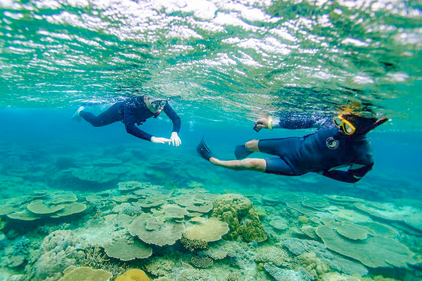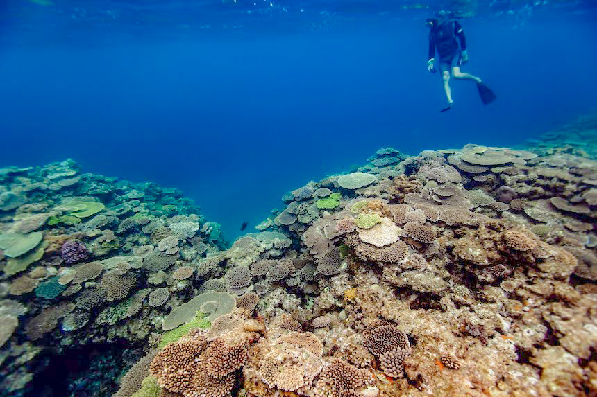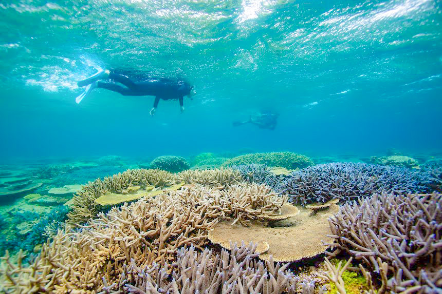 次はシュノーケリングです。「サンゴが見えたら、その上には立たないでください」など、レクチャーを受け、水中へこわごわ顔をつけました。体の力を抜き、落ち着いて口呼吸すると、リラックスできました。少し沖へ泳ぐと、生き生きとしたサンゴの群れが現れました。