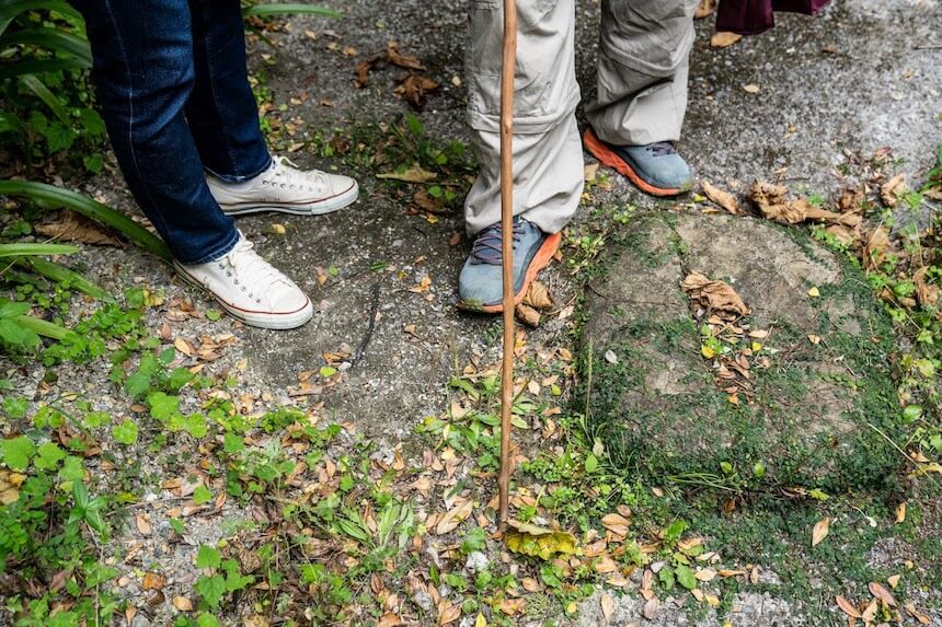 「こちらをご覧ください」別のカーでは、40~50センチ四方くらいの地面に食い込んだ石が。与那では「星石(フシイシ)」と呼ばれ、隕石だという言い伝えがあるそうです。