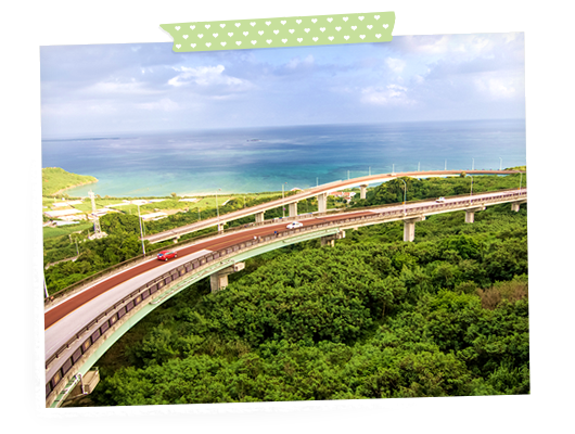 橋の途中は駐停車禁止なので、じっくり眺めたい場合は坂の上にある展望スポットから見よう。形状は一本の橋だが、坂の上から見て手前がニライ橋、海側がカナイ橋と別の名前がついている。ニライカナイとは、海の彼方にあるとされる聖地のこと。