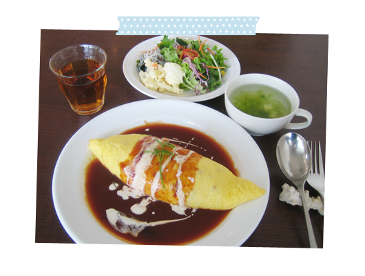 ランチメニューは肉と魚が選べる日替わりプレートをはじめ、パスタやオムライスといった洋食が中心。サイドメニューに付くサラダ、スープ、ドリンクはブッフェ形式で楽しめる。沖縄県産の旬のフルーツを使った自家製スイーツも豊富に揃うのでティータイムを過ごすのにもぴったり。カフェ周辺の森や御嶽をガイドと歩く「パワースポット巡り(カフェの食事付で約2時間)」も開催中(要予約)。
