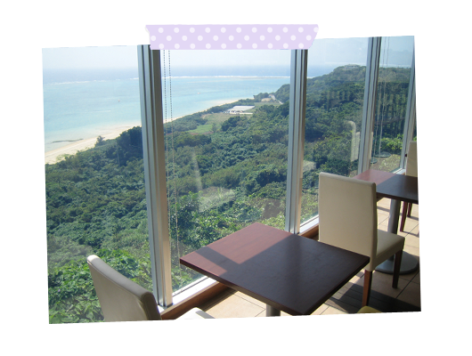 南城市の絶景カフェとして知られるカフェやぶさち。ガラス張りの店内からは、青い海が一望できる。