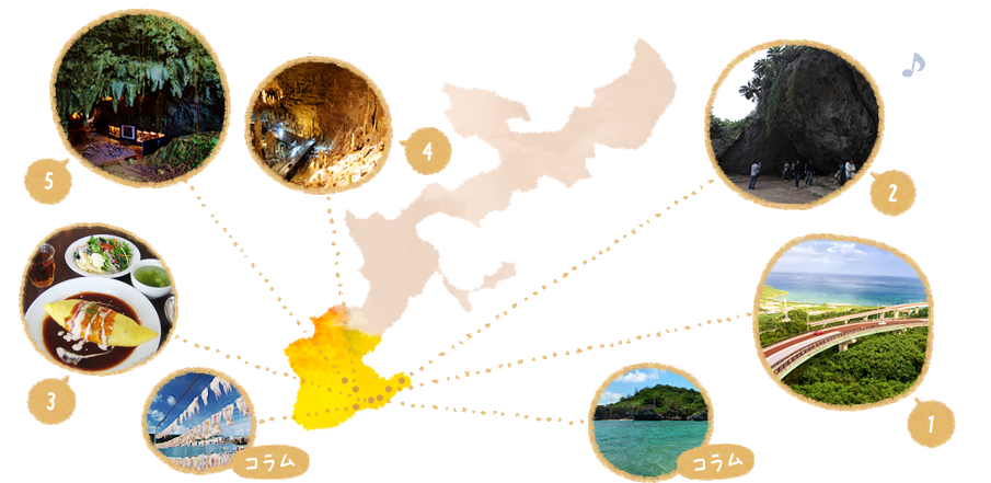 奥武島(おうじま)へ向かう道を通り過ぎて、海沿いから離れ右に折れていくとおきなわワールド文化王国・玉泉洞、