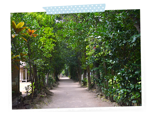 台風や海風の強い沖縄で防風林として利用されるフクギの並木が残るのどかな小道。まるで時間が止まったかのような、昔ながらの沖縄の風景が広がり、並木越しに海が見える場所も。そんな景観を生かしたカフェや宿も増えており、散歩する人の姿もちらほら。ただ、実際に暮らしている人もいるのでマナーを守って見学しよう。