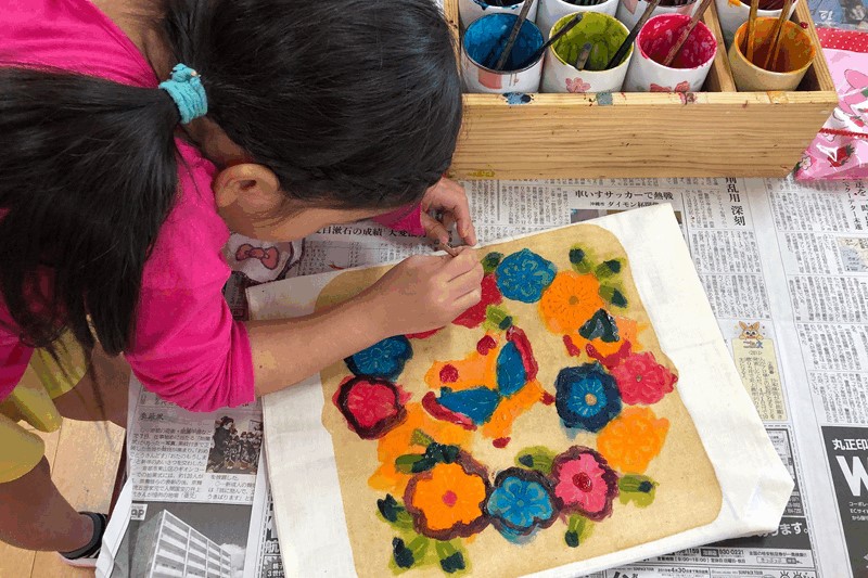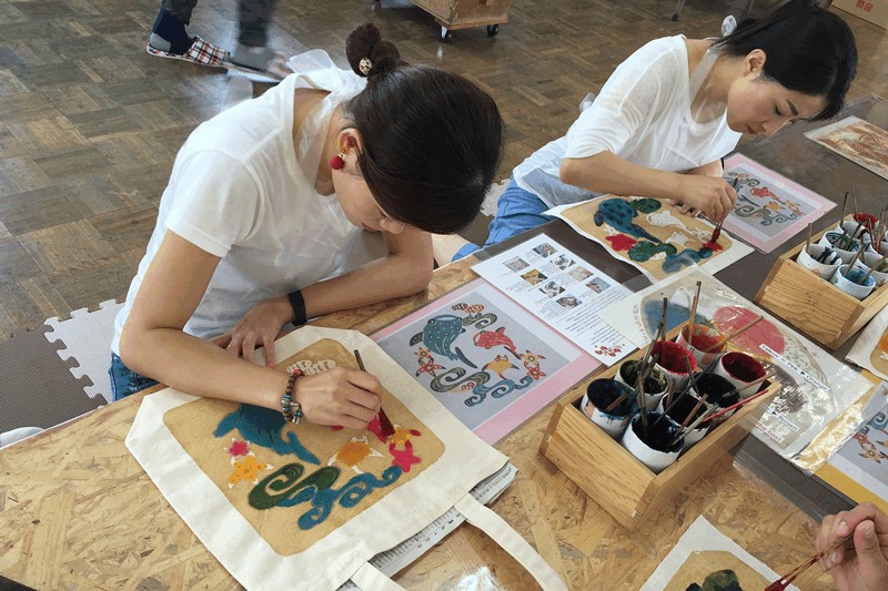 創業48年の紅型染めの工房兼ギャラリー。 「暮らしの中に紅型の彩りを」をコンセプトに、財布やスマートフォンケースなど、日常使いしやすい紅型アイテムを販売しています。 染付け体験は人気が高く、子どもも一緒に楽しめるプラン。あらかじめ糊置きされた布に、薄い色から濃い色の順に染めていきます。 ジンベエザメやシーサーなど沖縄らしい絵柄から、恐竜やクワガタなどキッズが喜ぶデザインまで用意されています。