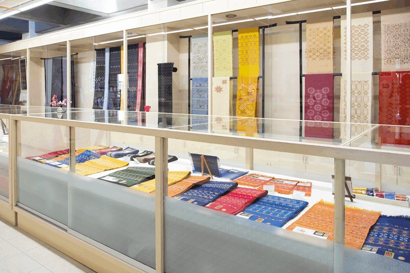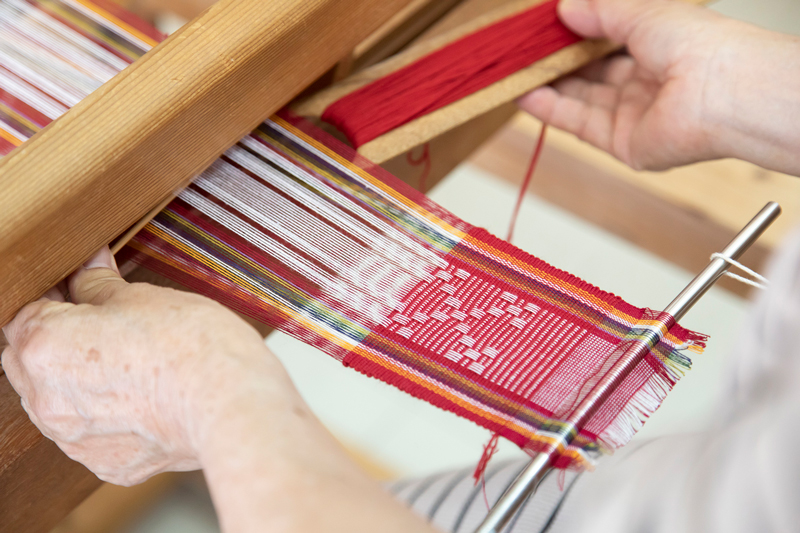 五つと四つの絣模様から構成される八重山ミンサー織。この模様には、「いつ(五)の世(四)までも末永く・・・」という意味が込められており、かつては、婚約の証として女性が帯を織って男性に贈ったといわれています。 工芸館では、バッグやネクタイ、小物などにアレンジした商品を販売。また織り体験は、30分程度で仕上げられるコースターから、本格的なテーブルセンターやタペストリーまで、指導員が丁寧にレクチャーします。