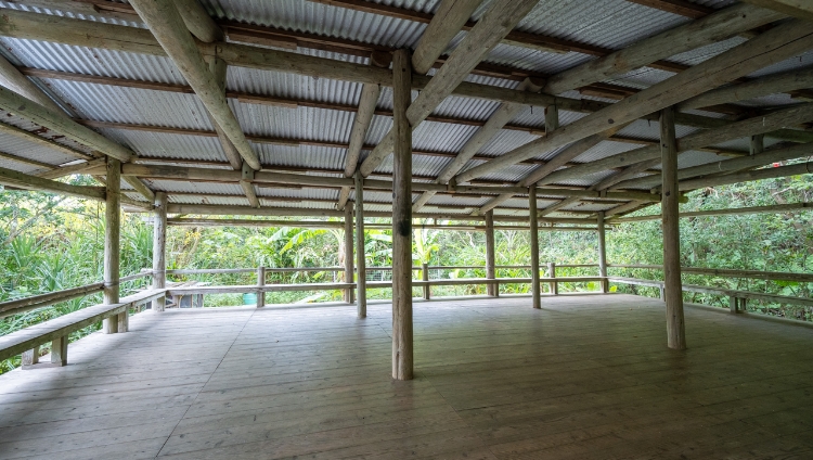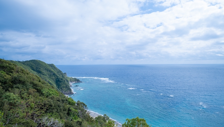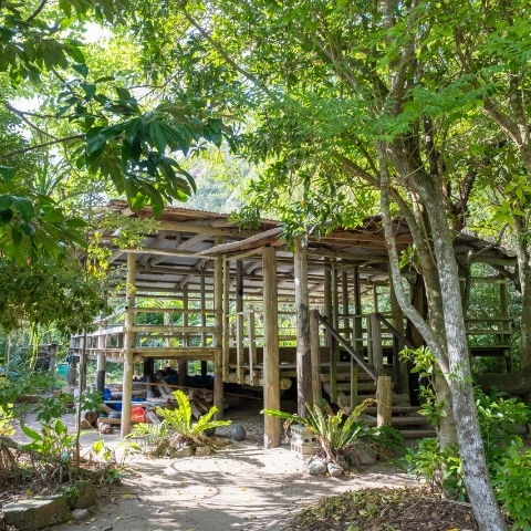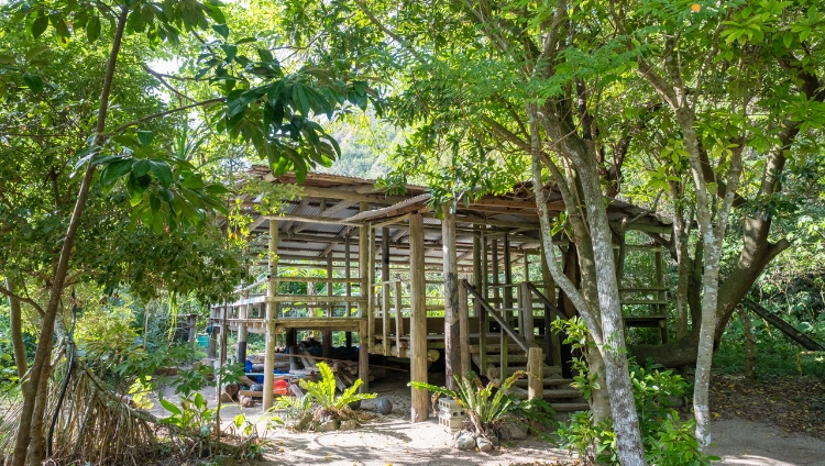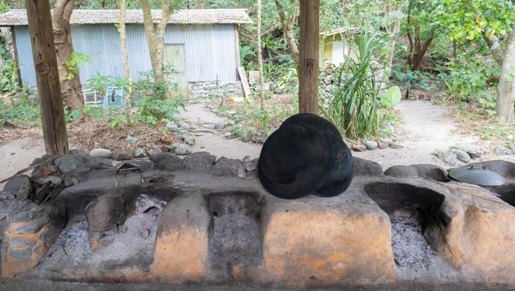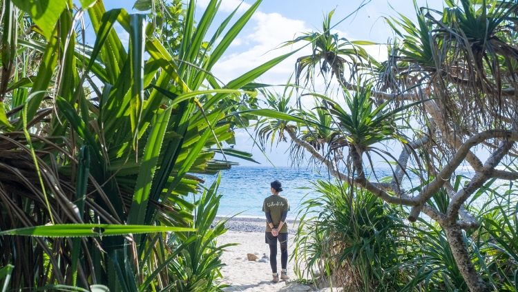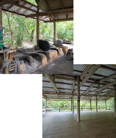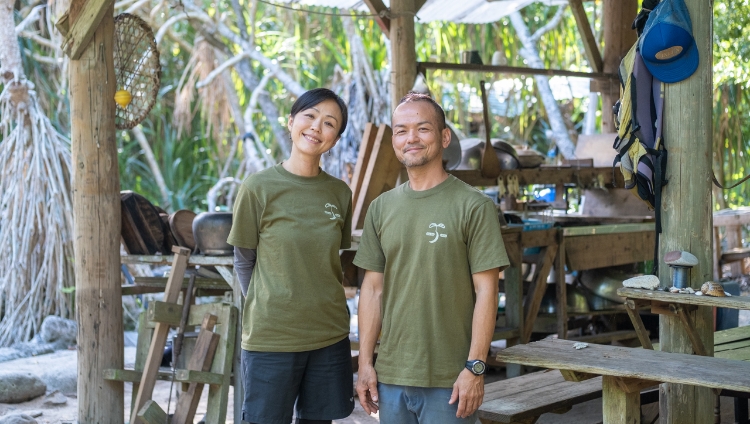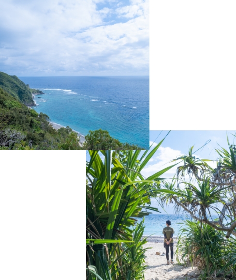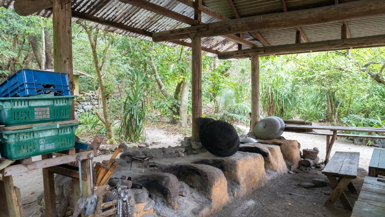 「じんぶん学校」には緑に囲まれた台所や高床式の小屋があり、アダン林を抜けるとそこには陸の離れ島のような「ヌーファの浜」が広がっています。