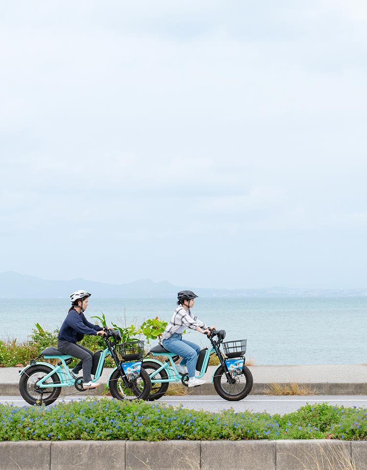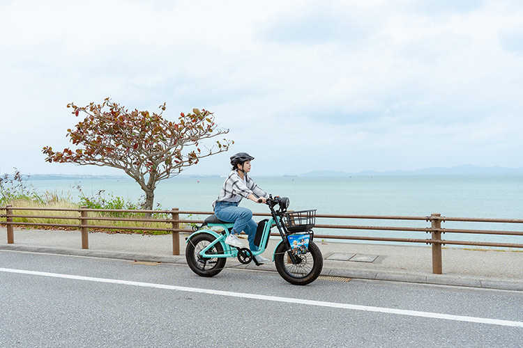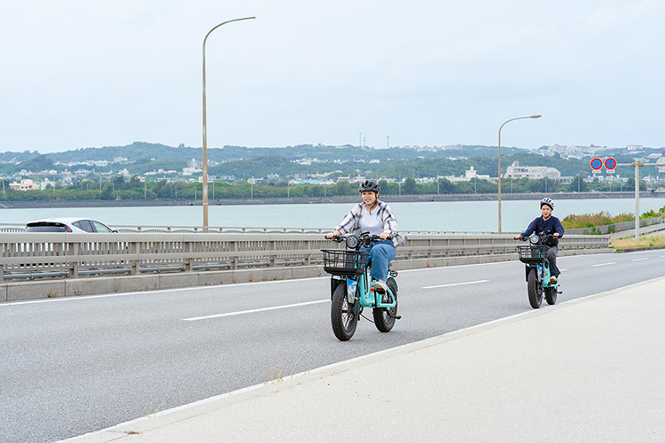 使用するのは、県内の工場で生産された電動アシスト自転車。坂道の多い沖縄の環境を想定した力強いアシスト性能が魅力で、安定した走行ができます。