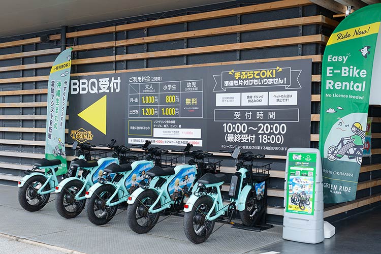 現在、GREEN RIDEのレンタルステーションは沖縄本島の8か所のほか、座間味島や宮古島にもあります。今回は、うるま市照間にある「東海岸BBQテラス」のステーションからスタート!