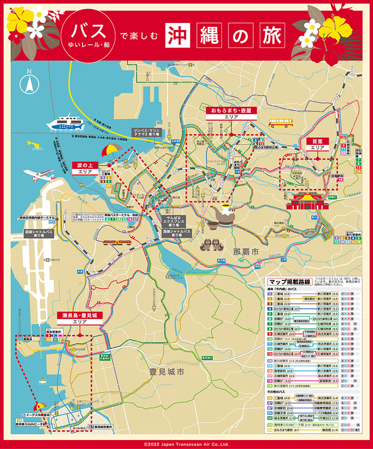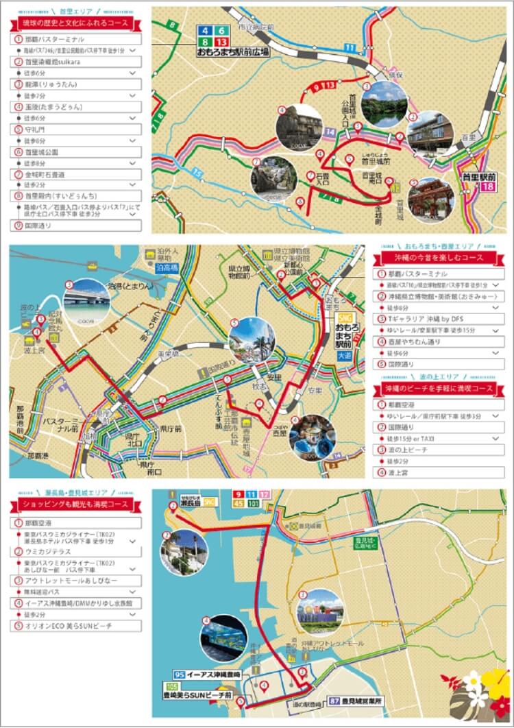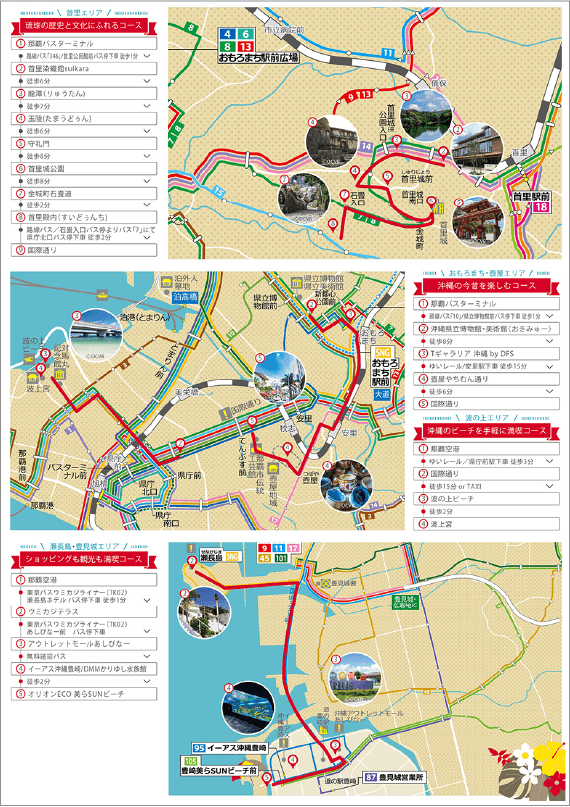このサイトには沖縄本島各地域や離島において、公共交通機関の利用で観光できるモデルコースが掲載されています。