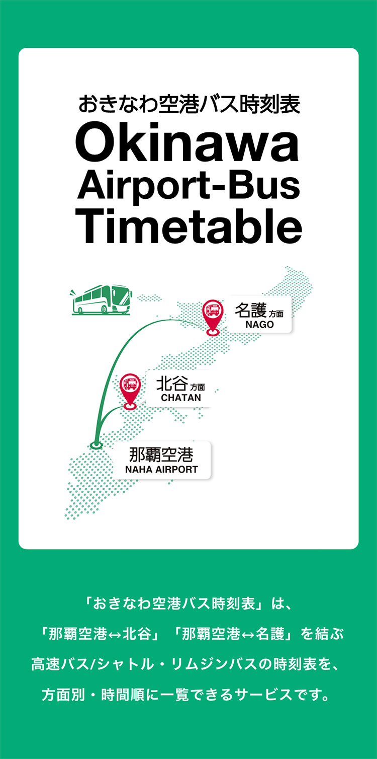 沖縄をベースに沖縄の島々と沖縄県外を結ぶJALグループの航空会社、JTA 日本トランスオーシャン航空はこのような課題を解決し、バス利用促進を図ることで沖縄観光の発展に貢献したいという想いから、那覇空港と沖縄本島の主要観光交通エリアである「北谷」および「名護」を結ぶ高速バス/シャトルリムジンバスの時刻表を一元化、わかりやすく調べることができるWebサイト「おきなわ空港バス時刻表」を開設しました。