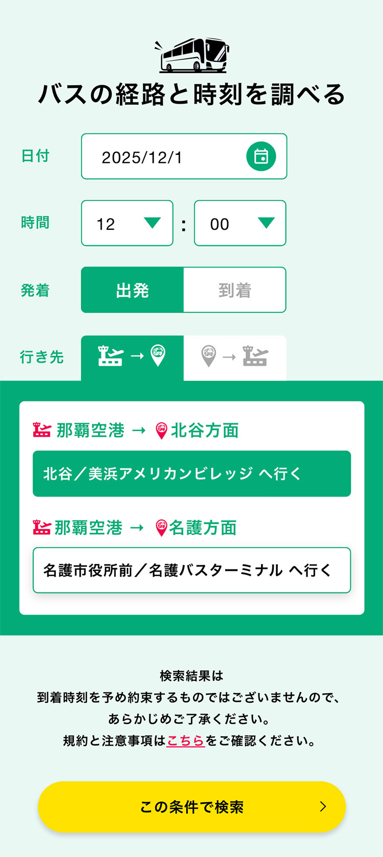 沖縄県内には同じ方面に複数のバス会社が運行しています。また、現行の経路検索サイトでは、地名やバス停名での検索が主流であるため、地名やバス停名を知らないと検索が難しいという課題があります。