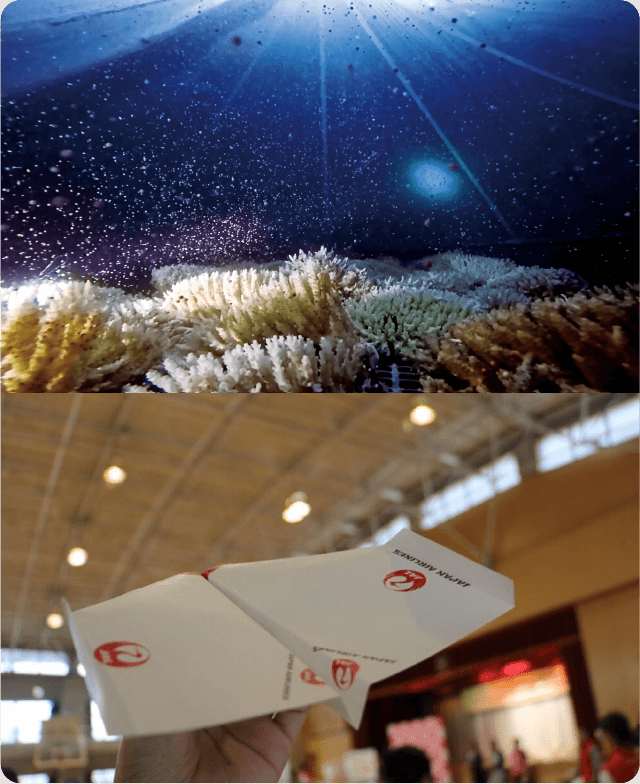 海水温の上昇や天敵の増殖で減少している沖縄のサンゴを守るために有性生殖法によるサンゴ再生支援の活動をおこなったり、地域の学校で現役社員が授業や講演をおこなったり、地域で開催される色々なイベントを多方面から応援したり、JTAでは環境・人・地域を意識し、「結∞アクション」と名付けてそれらの活動に積極的に取り組んでいます。