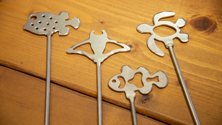 1995年には、那覇市の泊港ターミナル「とまりん」内に店舗をオープン。慶良間諸島(けらましょとう)を往来する船が発着することから、主にダイバー向けに商品開発を重ねていきました。森さん自身がダイバーであることから、「こんな商品があったらいいな」と思ったものを制作。お客さんからも「こんな商品が欲しかった」と当時好評だった、マンタやクマノミをデザインしたダイビング指示棒(カンカン棒)は、今も人気のロングセラー商品です。