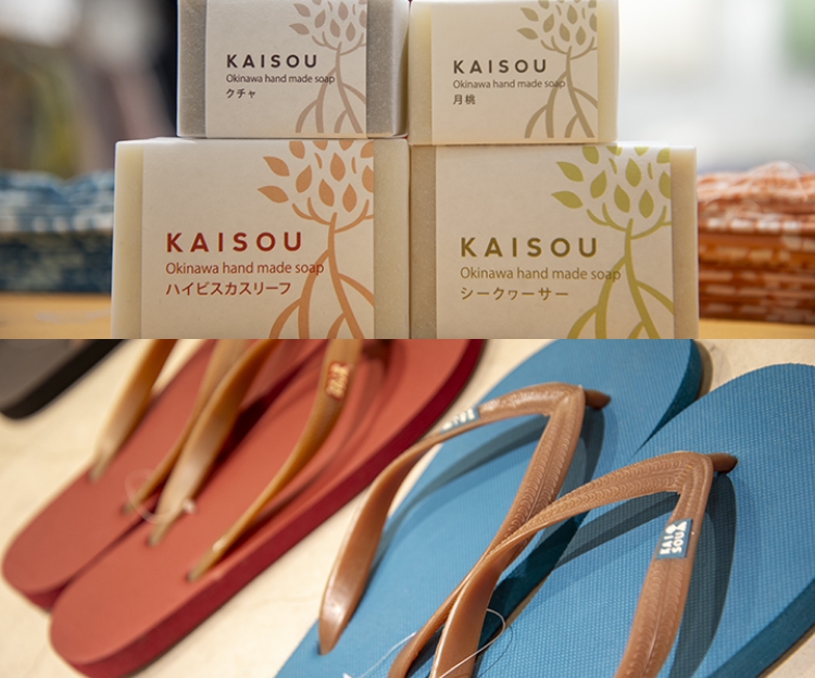その後、新店舗オープンを重ねると同時に、オリジナルアイテムのラインナップも豊富に。「平和通り店」の店内を歩いてみると、ハイビスカスや月桃など沖縄の素材と、万座沖の海洋深層水を使用した無添加石けんや、万が一海で波にさらわれても、漂着ゴミにならず自然に分解され土に還るという天然ゴム100%の植物由来ビーチサンダルなど、人と自然環境に配慮したアイテムがずらり。