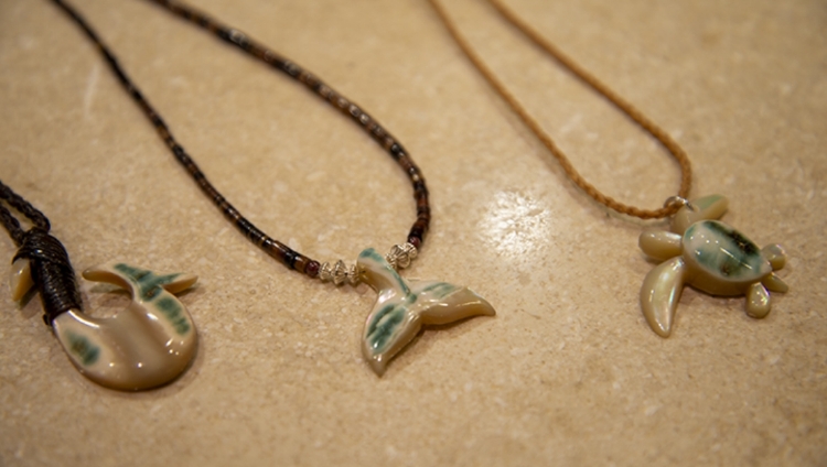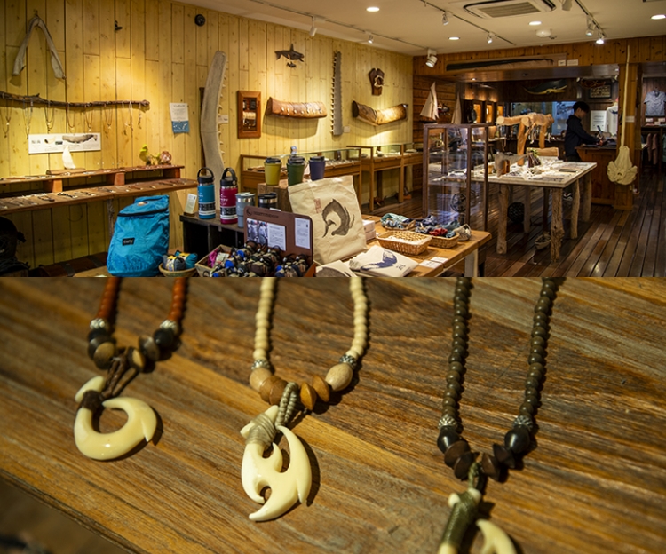 “海洋文化”がコンセプトの「平和通り2号店」には、スタッフが併設の工房で手作りしたクジラの歯やヒゲ、夜光貝などの貴重なアクセサリーも。
