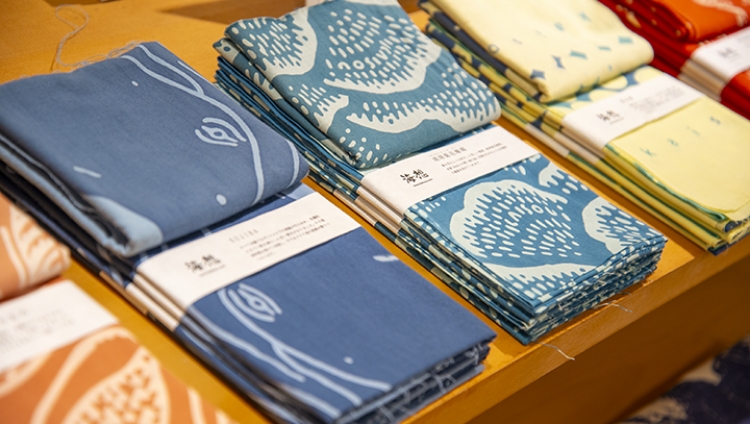 オリジナルのシャツは、高温多湿な気候でも快適に着られるようにと、麻(リネン)を取り入れたこだわりの素材。縫製は、丈夫で美しい縫い目、肌あたりのない着心地のよさを実現する高級シャツの縫製手法「巻き伏せ本縫い」。もともと沖縄にこの縫製ができる技術者がいなかったころ、森さんが知り合いの縫製職人さんに「技術を習得して海想オリジナルのシャツを作ってほしい」と依頼して実現したものです。さらに、ボタンには高瀬貝やココナッツボタンといった天然素材を使用。そして、テキスタイルは、「海想」のスタッフ自らが手がけたデザインで、サバニやサンゴなど、沖縄の海の文化が美しく表現されています。