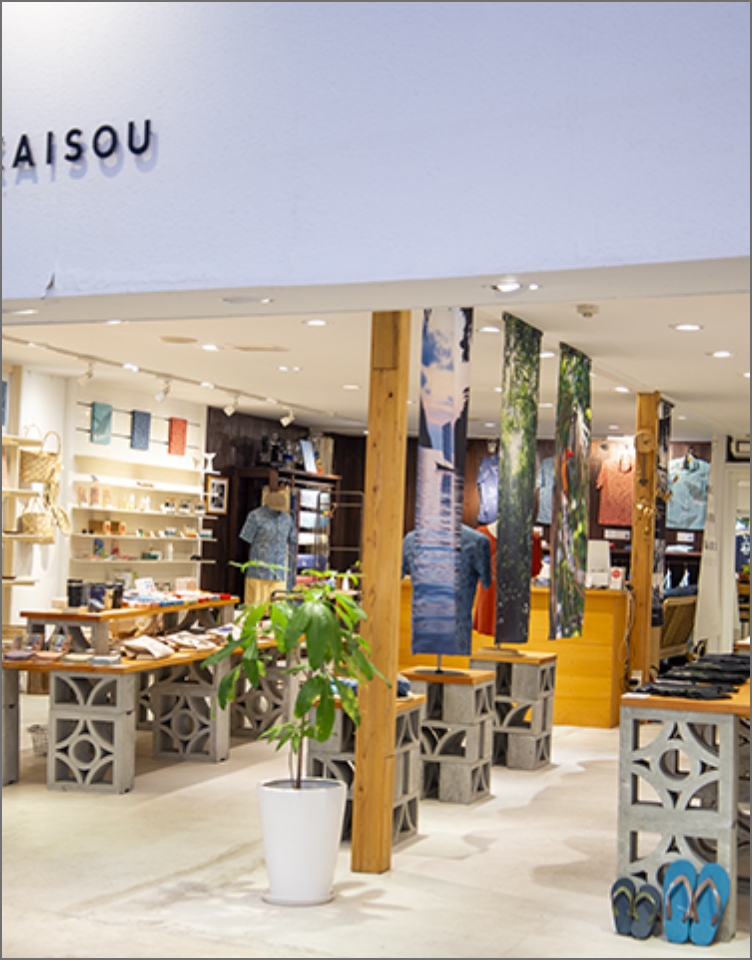 現在は、那覇市平和通りに2店舗、本島北部の本部町(もとぶちょう)に1店舗、計3店舗を展開しています。各店舗によってコンセプトがあり、内装やアイテムのラインナップが少しずつ異なるため、店舗ごとにさまざまな雰囲気を楽しむことができ、また3店舗を巡ってみると、海想が大切にしていること、伝えたい世界観をより深く感じとることができるのが魅力です。