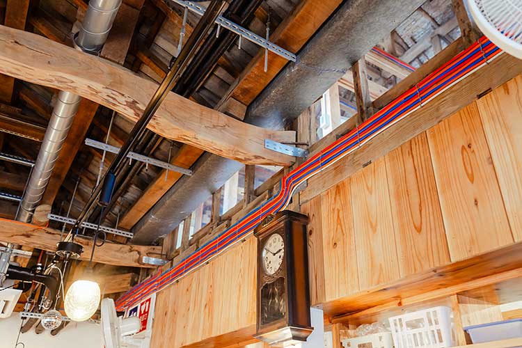 木材は地域の工務店からの提供で、工事現場で出た廃材を活用。梁や天井など建物の基礎となる部分は建築当時のまま。旧伊集商店で使われてきた古時計などは現在の店舗でも使用されていて、当時の雰囲気が伝わってきます。