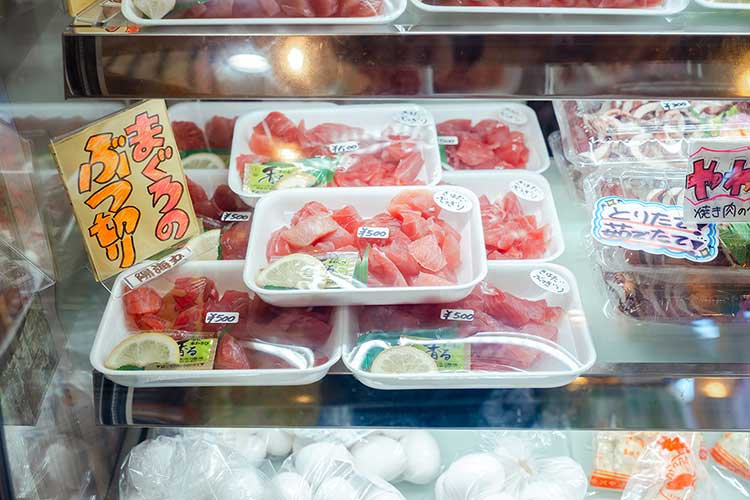 ショーケースに並ぶ刺し身は、その日取れた新鮮なものばかり。夕方には売り切れてしまうほどの人気商品で、この日はキハダマグロが販売されていました。