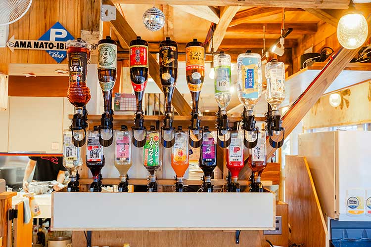 夜の時間帯になると、お客さん自らお酒を作るセルフスタイルの居酒屋に変わります。来店客同士で自然と会話が生まれ、町の歴史や、昔の思い出話など地元の人ならではの話が出ることも。