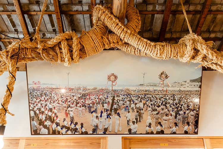 テーブル席の真上、一番目立つところに飾られた写真は、30年以上前に撮影された与那原町の伝統行事、与那原大綱曳の写真です。与那原大綱曳は沖縄3大綱曳の一つとされ、無病息災や五穀豊穣を願って、長さ90メートル、重さ5トンを超える大綱を曳き合います。綱の製作は町民総出で行われる、まさに一大行事です。