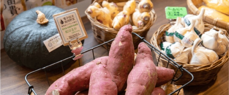 オーガニックのなかでも、てんぶすがこだわるのは「人間を安心、安全に導いてくれるもの」。たとえば炭とマイナスイオンを使い、土から健康にしておいしい野菜をつくる農法「電子技法」で育てた野菜のように、作り方や製法まで確認して仕入れています。