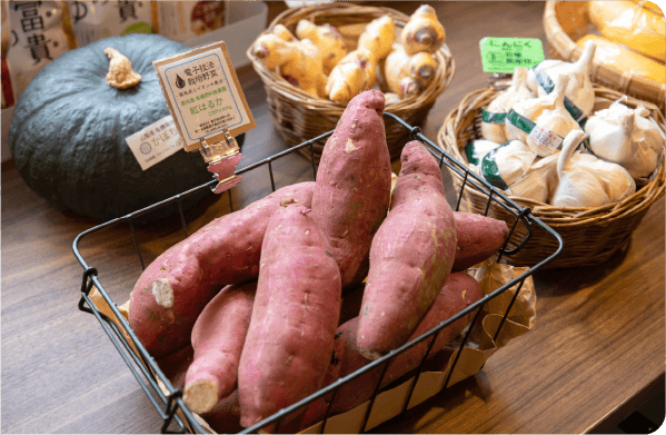 オーガニックのなかでも、てんぶすがこだわるのは「人間を安心、安全に導いてくれるもの」。たとえば炭とマイナスイオンを使い、土から健康にしておいしい野菜をつくる農法「電子技法」で育てた野菜のように、作り方や製法まで確認して仕入れています。
