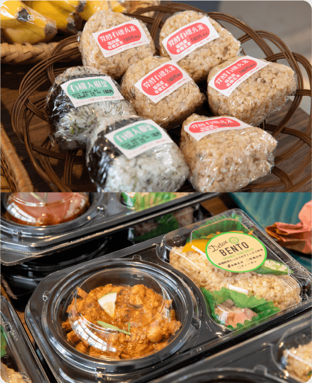 有機野菜と発酵玄米を使用した、手づくりの玄米弁当やおにぎりの販売もあり、近くのホテルに宿泊する旅行客が買っていくことも多いのだそう。