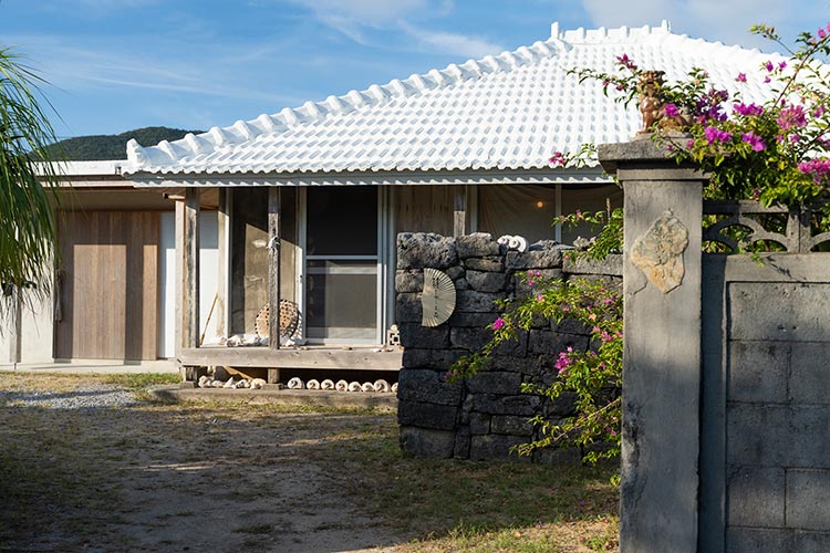 伊平屋港から車で3分ほどの我喜屋集落にある民具アトリエ「種水土花」は、古民家を改装した落ち着いた空間。是枝さんの手がけた民具が並べられています。