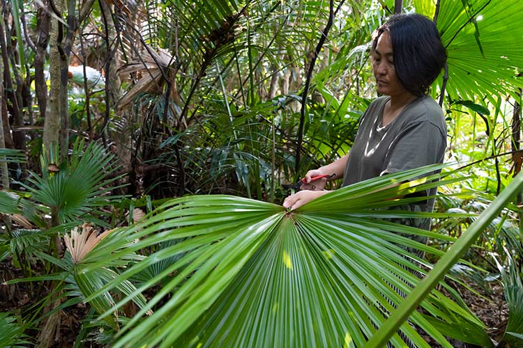 種水土花で使用する素材は、近所の山から必要な分だけ収穫したもの。伊平屋島では昔からビロウ(クバ)が豊富に自生し、島の人々は葉で笠や扇などをつくってきました。