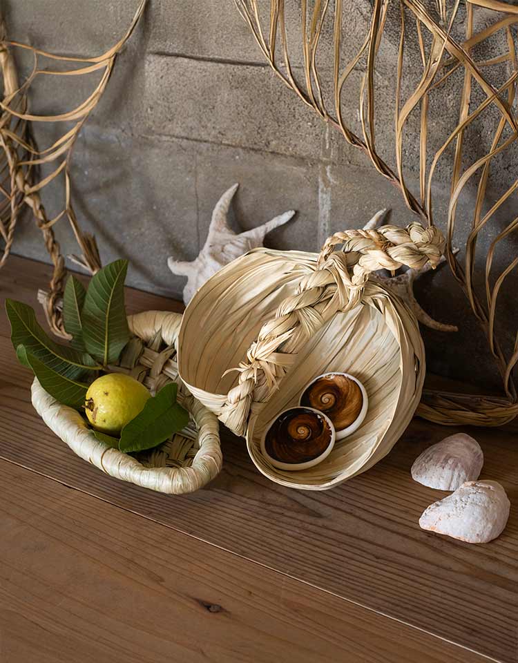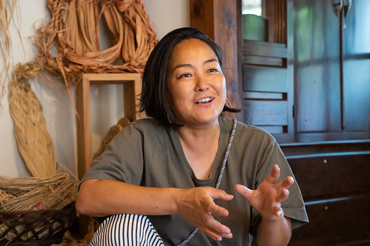 そんな伊平屋島で、カゴやトレーといった暮らしの道具からピアスやブレスレットなどのアクセサリーを、島の植物を使ってつくっているのが、民具アトリエ「種水土花(しゅみどか)」。主宰する是枝麻紗美さんにお話を伺いました。