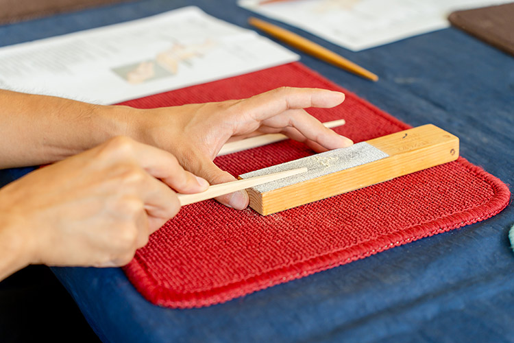 自分の手に馴染む木材を選んだ後は、鈴木さんお手製の研磨道具を使い、食い先から持ち手の順に削っていきます。安全な道具を使用するため3歳くらいから保護者と一緒に体験ができるそう。削り方のポイントは“食い先を四角く、まっすぐにすること!”とアドバイスを受けながら仕上げていきます。時折、箸にまつわるクイズや冗談を交えながら和やかな雰囲気で箸作り体験は進みます。