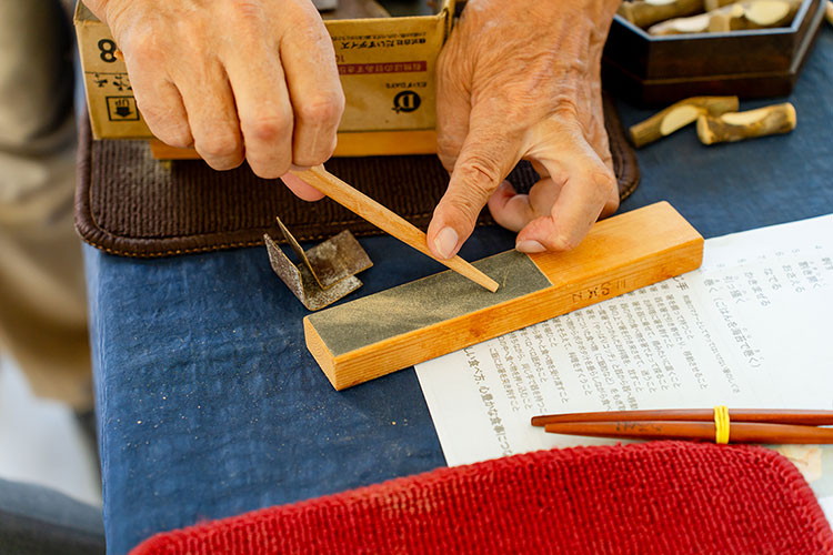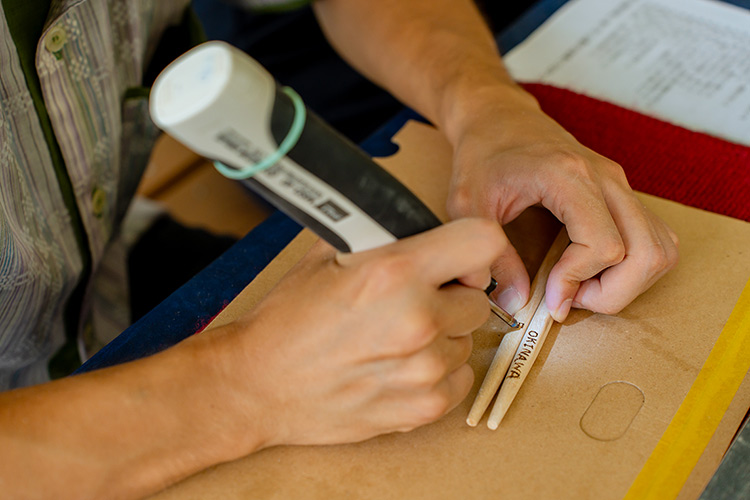 形を整え、表面を滑らかにしたら、名入れをしアマニ油(食用油)を軽く塗り、世界に一つだけのマイ箸が完成です。