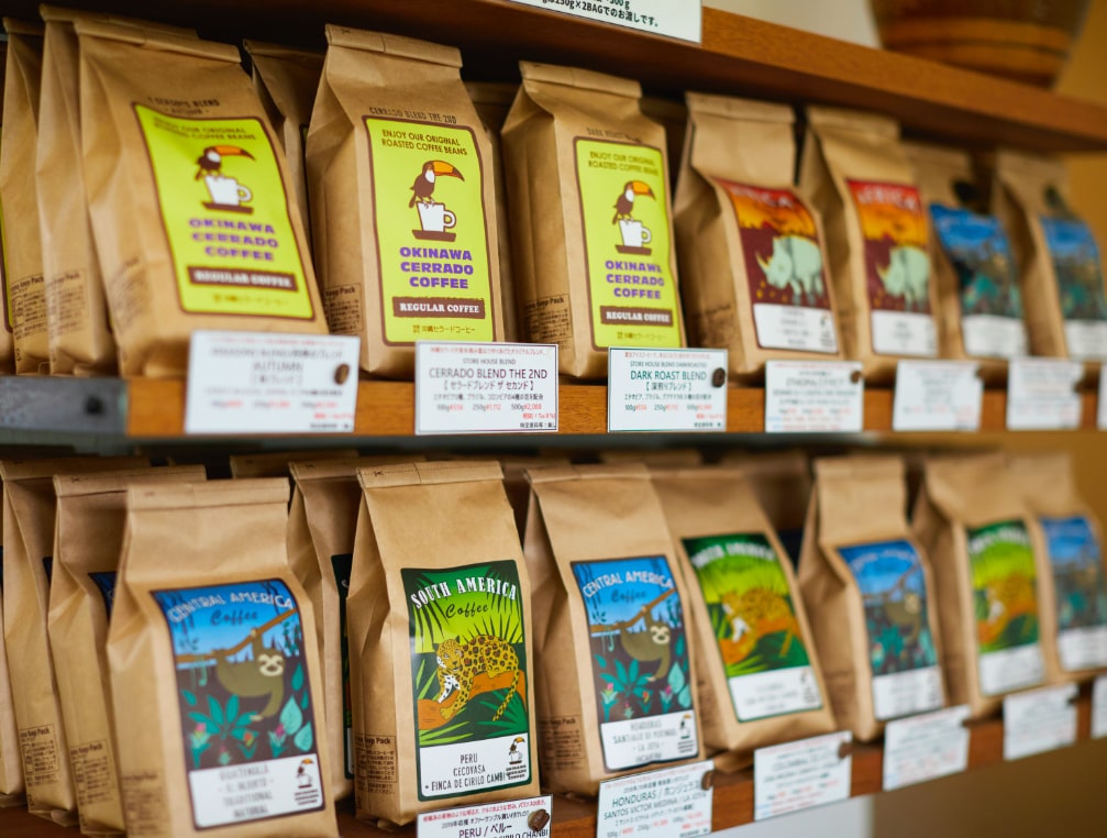 店内には、オリジナルブレンドやスペシャルティコーヒー、カフェインフリーのデカフェなどが並ぶ。入手困難な希少品種や沖縄県産のオリジナルコーヒー豆(4月~7月)もお見逃しなく。