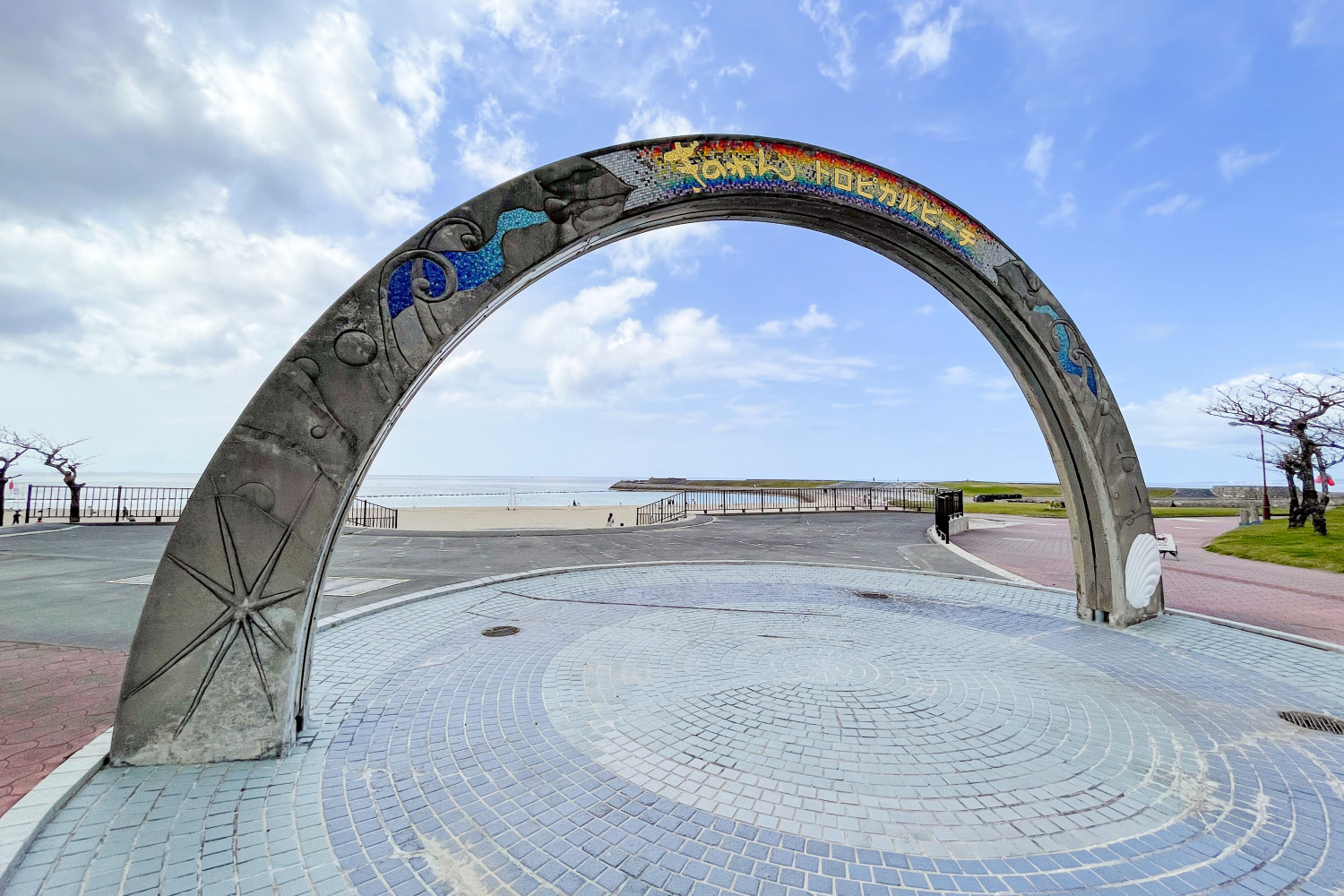 宜野湾市にあるトロピカルビーチの南国ならではの海とさんごポケモンの「サニーゴ」とランデブーポケモンの「ラブカス」がデザインされています。