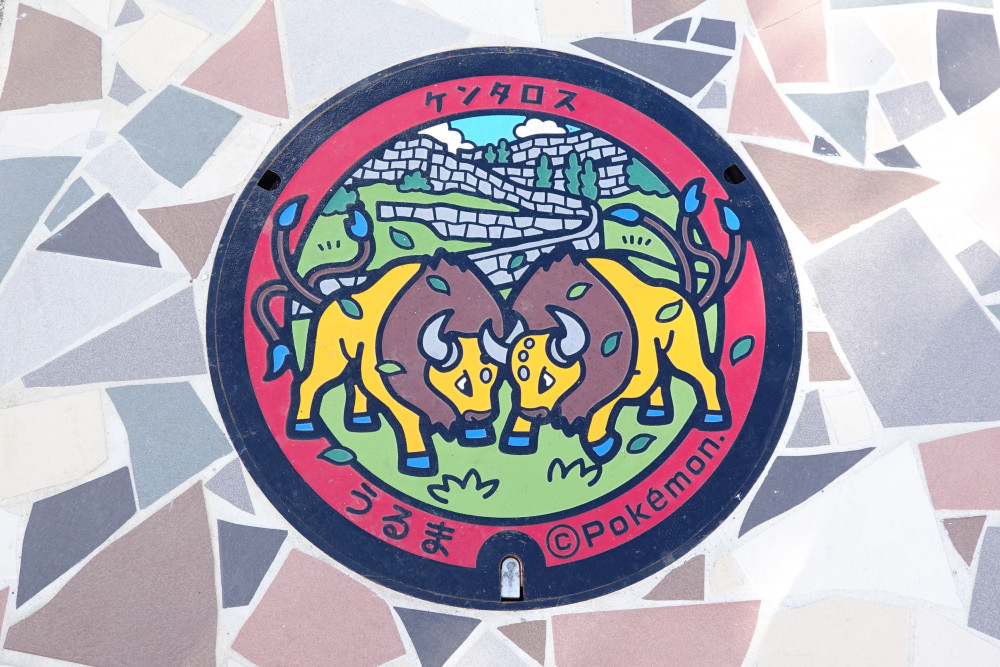 世界遺産に登録してある「勝連城跡」とうるま市で盛んな闘牛をイメージしたあばれうしポケモンの「ケンタロス」がデザインされています。