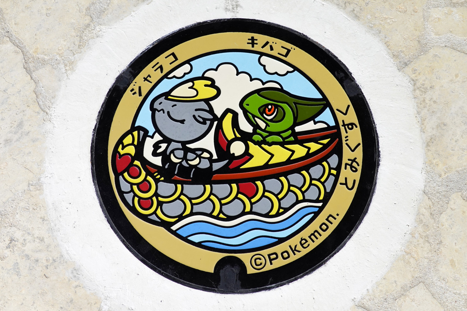 爬竜(ハーリー)発祥の地とされる豊見城市では爬龍船(はりゅうせん)にのるドラゴンタイプのキバポケモンの「キバゴ」とうろこポケモンの「ジャラコ」がデザインされています。