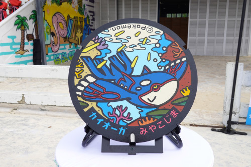 宮古島市のサンゴ礁を泳ぐかいていポケモンの「カイオーガ」がデザインされています。