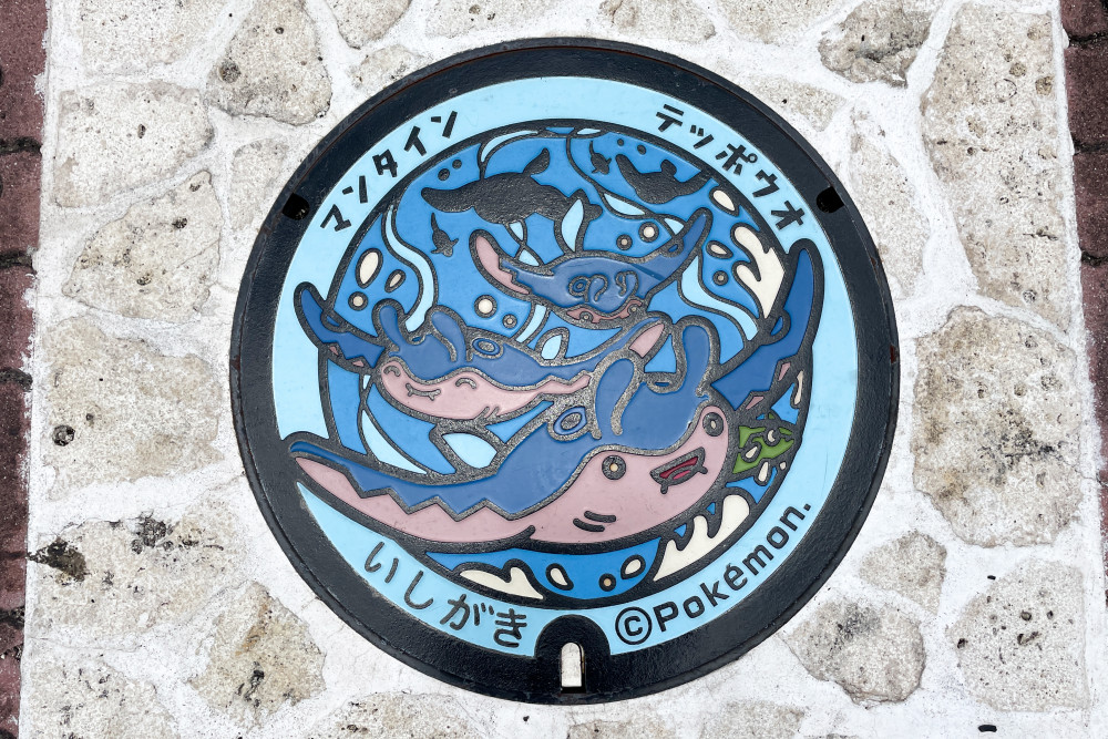 石垣市の青い海を泳ぐカイトポケモンの「マンタイン」とふんしゃポケモンの「テッポウオ」がデザインされています。