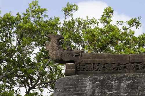 中央部分が高くなだらかに流れる曲線を持つ屋根。これは日本の寺院に良く見かける形です。さらに、屋根の中央部分には唐草模様の彫刻をほどこし、火焔宝珠(かえんほうじゅ)やシャチをかたどった鴟尾(しび)の石彫がついています。アーチ門も一見すると石をかみ合わせた構造に見えますが、実は石の弓型状に削った手の込んだもの。