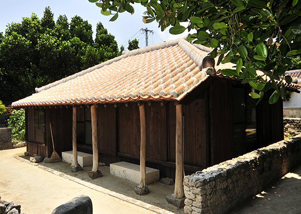 赤瓦の屋根と珊瑚の石垣が印象的な古民家
