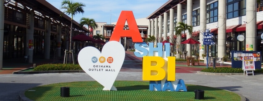 本島唯一のアウトレットモール、あしびなーは、100店舗余りのショップが並ぶお買い物スポット。1階部分が主にショッピングエリア、2階はお食事処がメインになっています。