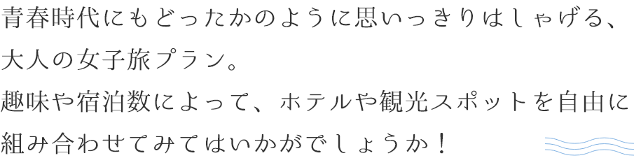 青春時代にもどったかのように思いっきりはしゃげる、大人の女子旅プラン。趣味や宿泊数によって、ホテルや観光スポットを自由に組み合わせてみてはいかがでしょうか!