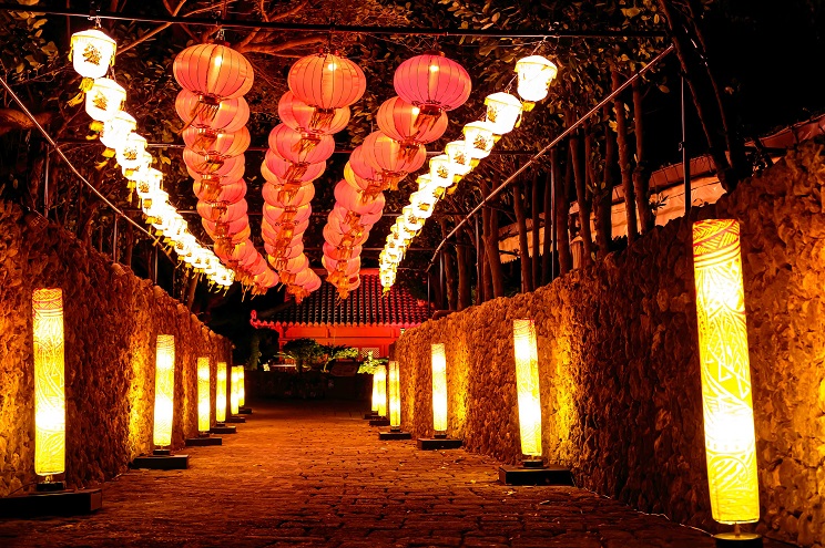 ランタンや灯籠が琉球王朝時代の街並みを彩る