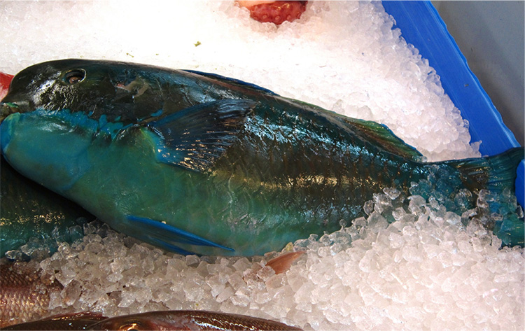 - 公設市場の魚売り場でよく見かける青い姿の魚はブダイ科の仲間で、淡白で食べやすいとお刺身や酢味噌和え、煮物などで食されています。イラブチャーというと青い姿を思い浮かべますが、実は黒や赤、白などいろんな色をしたブダイがいます。また、イラブチャーの内臓は有毒性があるので、飲食店で調理したお料理を楽しむことをオススメします。