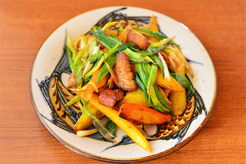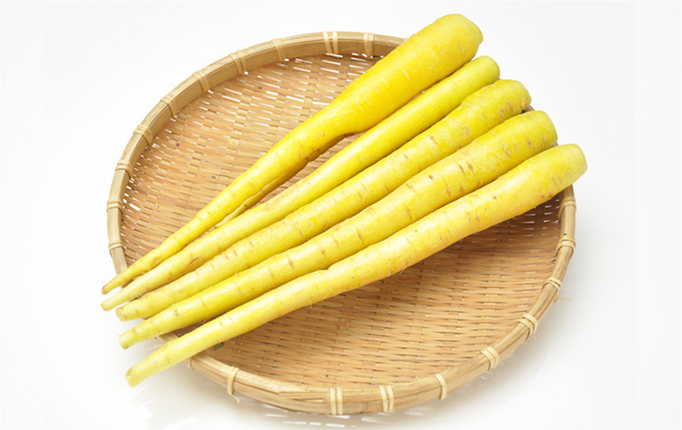 - 一般的なにんじんより細長く、薄い黄色をした沖縄の在来種です。ゴボウのような見た目ながら、味はほのかな甘みがあり、柔らかな食感と独特のさわやかな香りが楽しめます。カロテンが豊富に含まれているので、昔から薬膳料理に用いられていました。今では創作料理や洋風料理にも用いられており、沖縄ならではの根菜として幅広い味わいを楽しめます。