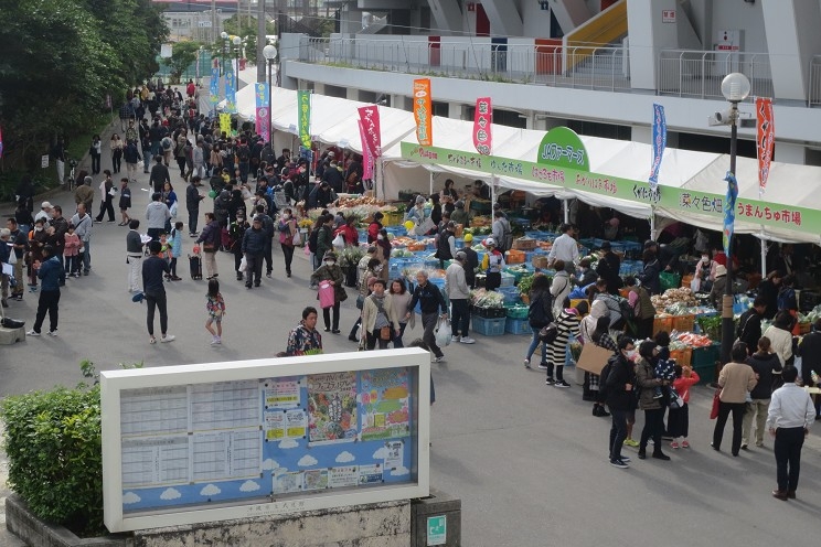 「地産地消」をテーマに、生産者と消費者をつなぐイベント。沖縄県の農林水産業を盛り上げ地域との結びつきを深めることを目指しており、フラワーデザインコンテストといった花に関する様々なイベントをはじめ「お肉のまーさん市場」や「海鮮市場」など、県産の農林水産物が集結しています。